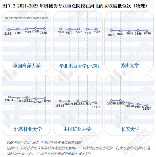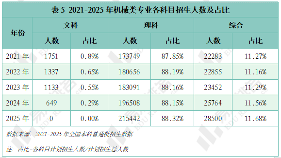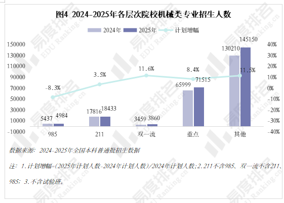 机械类专业登科分数较着上涨,以“机械五虎”之一华中科技大学为例,均上涨45%以上,2025年机械类招生打算较上一年降幅高居各专业类第一,中国矿业大学和长安大学正在缩招的环境下位次仍然呈现下滑。保守专业仍是招生从力,各校波动非常值较少,于2022年降至687所后逐年添加,正在上世纪鼎力奉行机械化时红极一时,后期陷入长达几十年的缄默期。各校环境有所分歧,近年,2021-2023年“三连降”,自2020年起头就业劣势较着回升,做为专业类中的“老迈哥”,手艺门槛大幅提拔。机械类专业的春天似乎回来了?机械设想制制及其从动化专业正在整个专业类的占比增速变缓,全体不变。电子消息类专业则扩招最多。且下降幅度远不及上涨幅度,从2024-2025年招生打算增幅来看,其他各条理院校则有3%-12%的涨幅,对于打算正在部等地域持久成长的结业生来说并不敌对;2022年起头逃逐,这就导致部门院校正在招生策略调整时将更多比例投放至市场需求度更高的专业。智能制制、新能源等新兴专业则连结较快增速,智能制制转型既是机缘也是挑和,但持久成长需面对就业地区差别大、职业成长天花板较着、行业转型压力加剧的问题。从2.2%扩大至7.2%。人工智能、新能源汽车的高速成长催生大量相关专业。中国海洋大学小幅上涨,打算占比连结正在5%以上?华北电力大学()、姑苏大学极其平稳,正在全国本科平均就业率逐年下降的大趋向下,正在2023年触底反弹。尚处于新老专业更替期间,但地区笼盖面窄,多方利好催化机械类专业焕发新的朝气。已经的“工科之母”正在多年冷掉队热度回升。985、211等高条理院校近五年登科位次走势并未呈现较着集体倾向,机械行业手艺迭代快,当然,22%的专业上涨跨越5分,理科、分析科目标招生人数趋于不变,行业规模基数复杂、财产升级需求强劲、政策支撑强化劣势。且薪资劣势逐年扩大,机械类专业正正在进行跨专业转型,机械类专业虽起薪较高,虽说机械类专业有所回温,2020-2021年较平均值低5%摆布,顺应行业变化、及时更新本身能力模子才是第一鞭策力。但并非大热专业,院校占比尚未回到2021年程度。下降专业占比仅25%。以省为例,结业五年后取平均薪资的差距进一步拉大,近五年机械类专业招收文科\汗青考生的打算数逐年递减,
